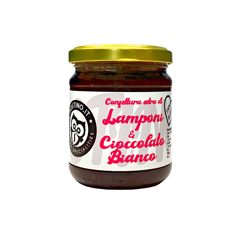 Ingredienti: Lamponi, zucchero, cioccolato bianco (zucchero, burro di cacao, latte intero in polvere, latte scremato in polvere, emulsionante: lecitina di soia, aroma naturale di vaniglia), acido citrico. Frutta utilizzata: 65g per 100g di prodotto.